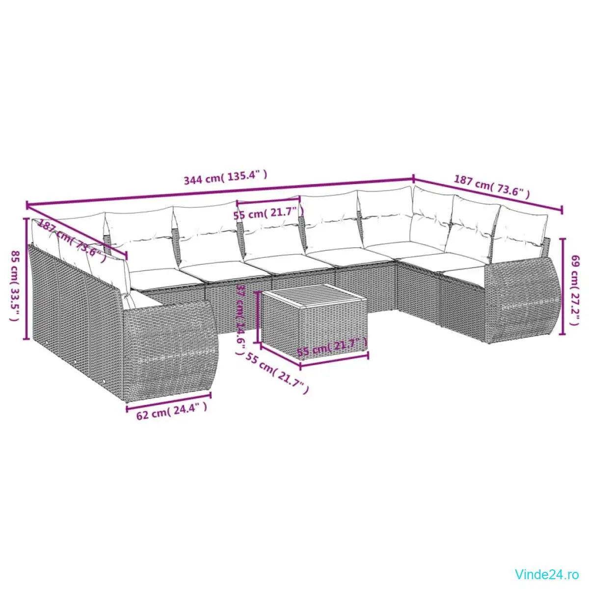 • Dimensiuni perne de șezut: 55 x 55 x 3 cm (l x ad. x gros.)