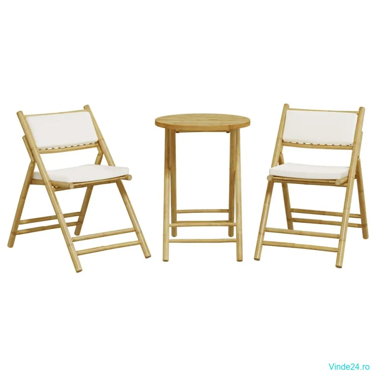 vidaXL Set de bistro pliabil, 3 piese, cu perne alb crem, bambus