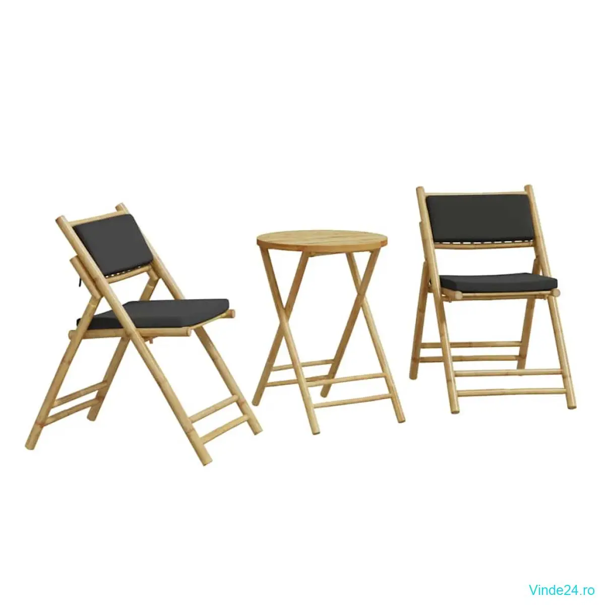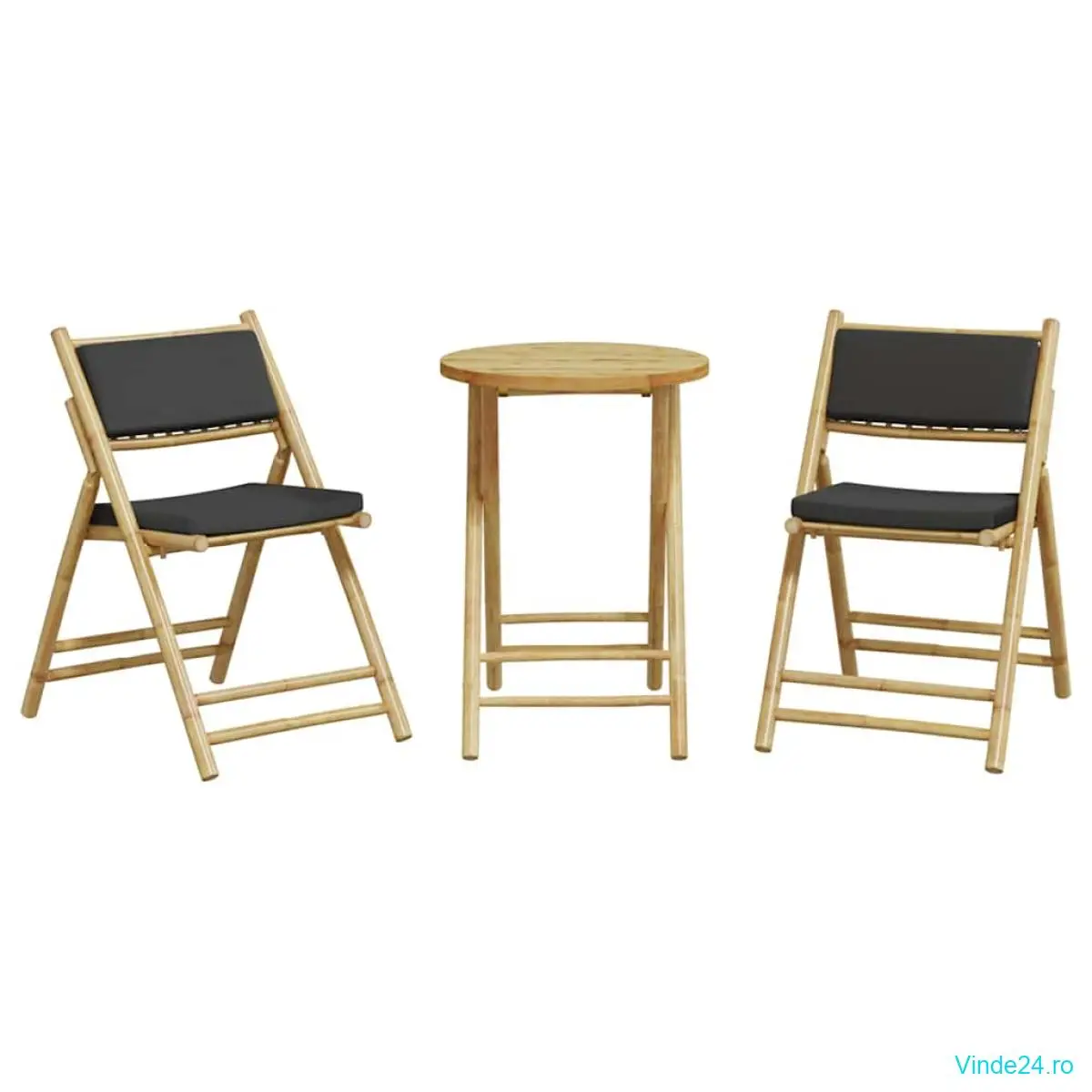 vidaXL Set de bistro pliabil, 3 piese, cu perne gri închis, bambus