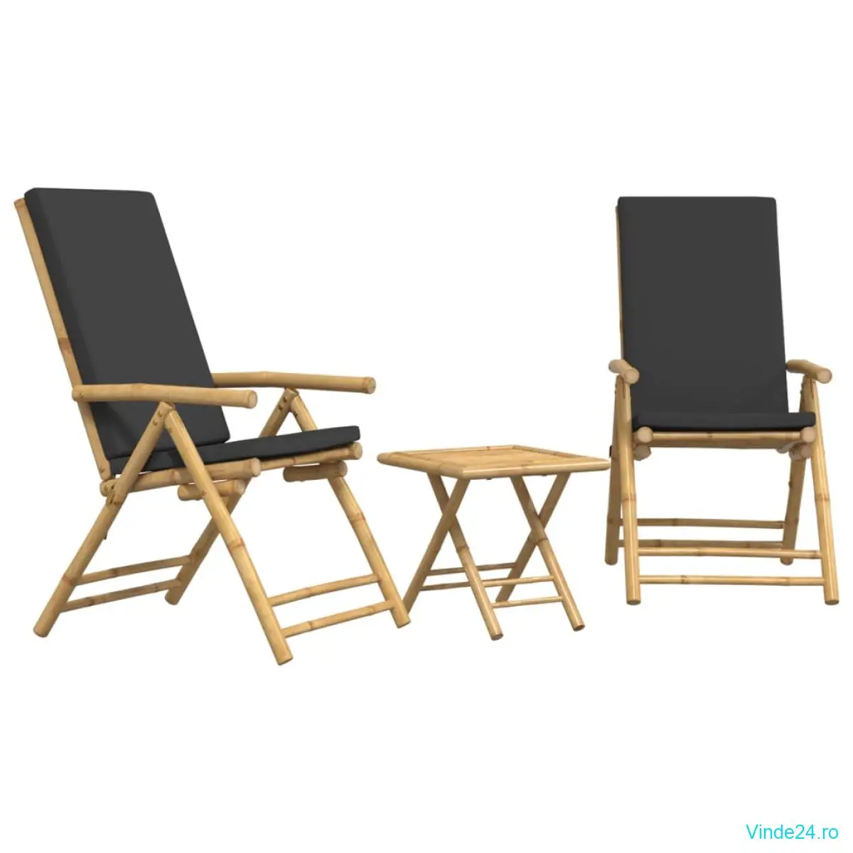 vidaXL Set de bistro pliabil, 3 piese, cu perne gri închis, bambus