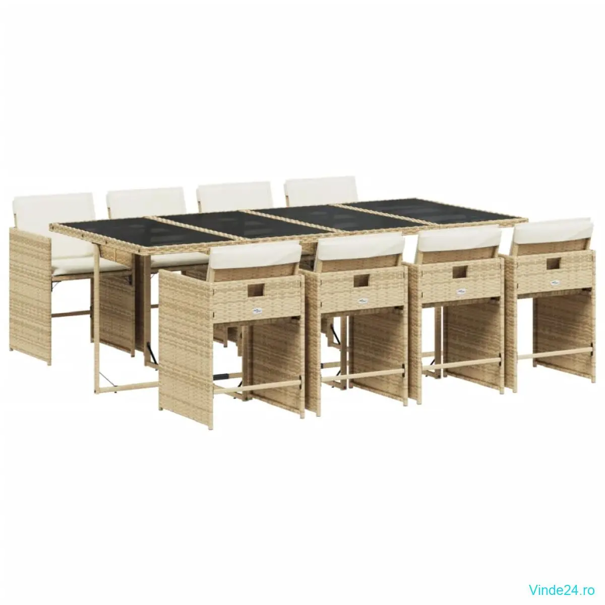 vidaXL Set de masă pentru grădină, 9 piese, cu perne, bej, poliratan