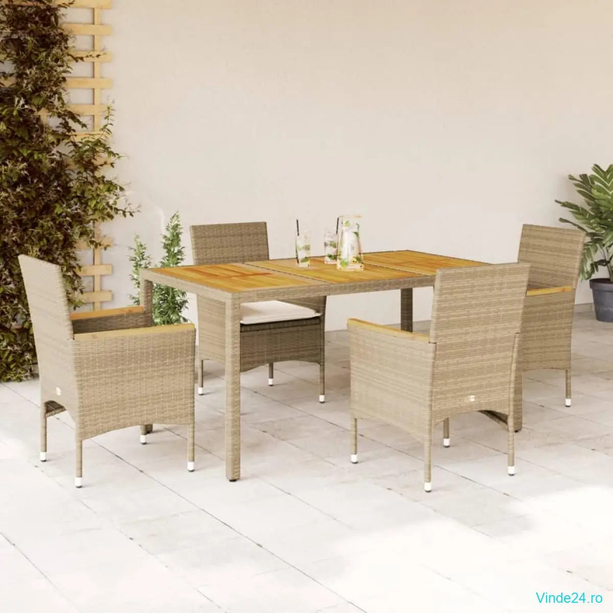 • Material: Ratan PE, oțel vopsit electrostatic, lemn masiv de acacia cu finisaj în ulei