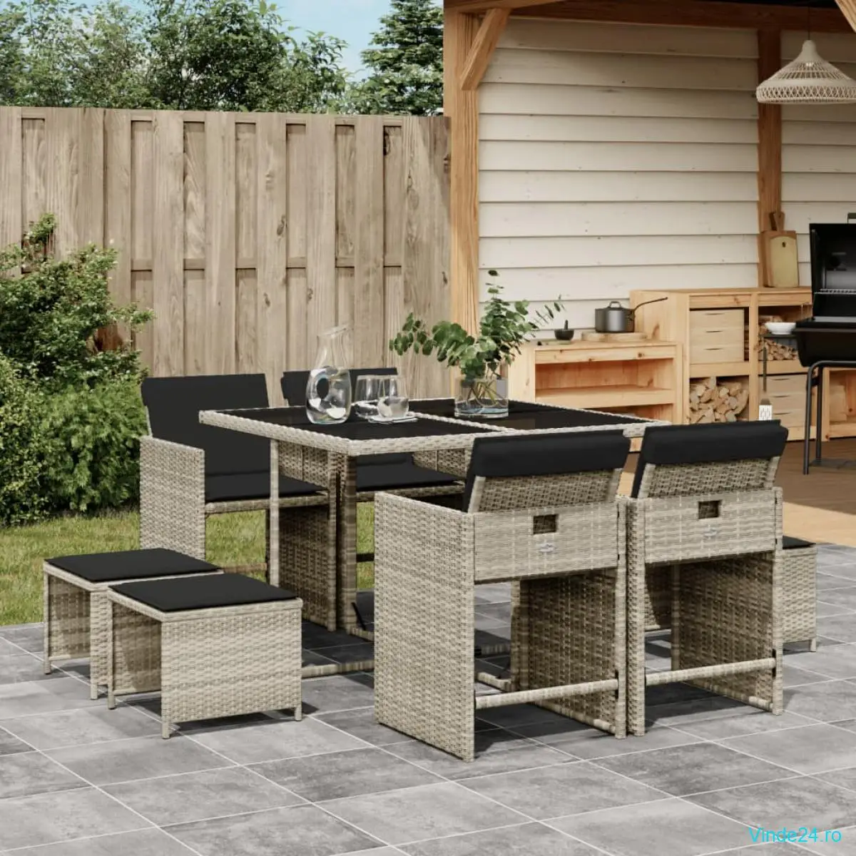 vidaXL Set mobilier grădină cu perne, 9 piese, gri deschis, poliratan