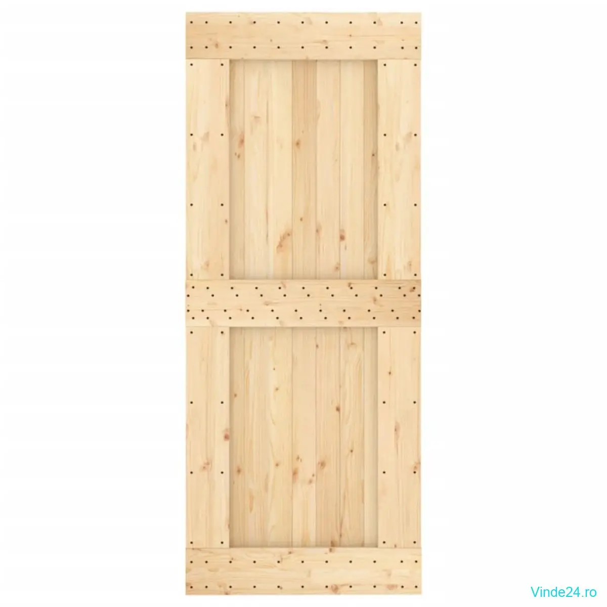 - Lemn masiv de pin: Această ușă de interior este realizată din lemn masiv de pin. Lemnul masiv de pin este un material natural frumos. Lemnul de pin are o granulație plană, iar nodurile conferă materialului unicitate și un aspect rustic.