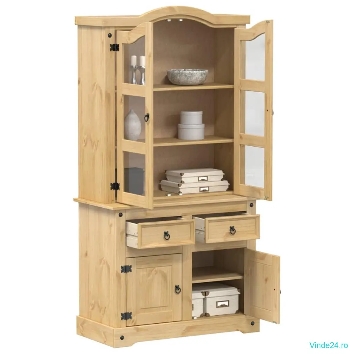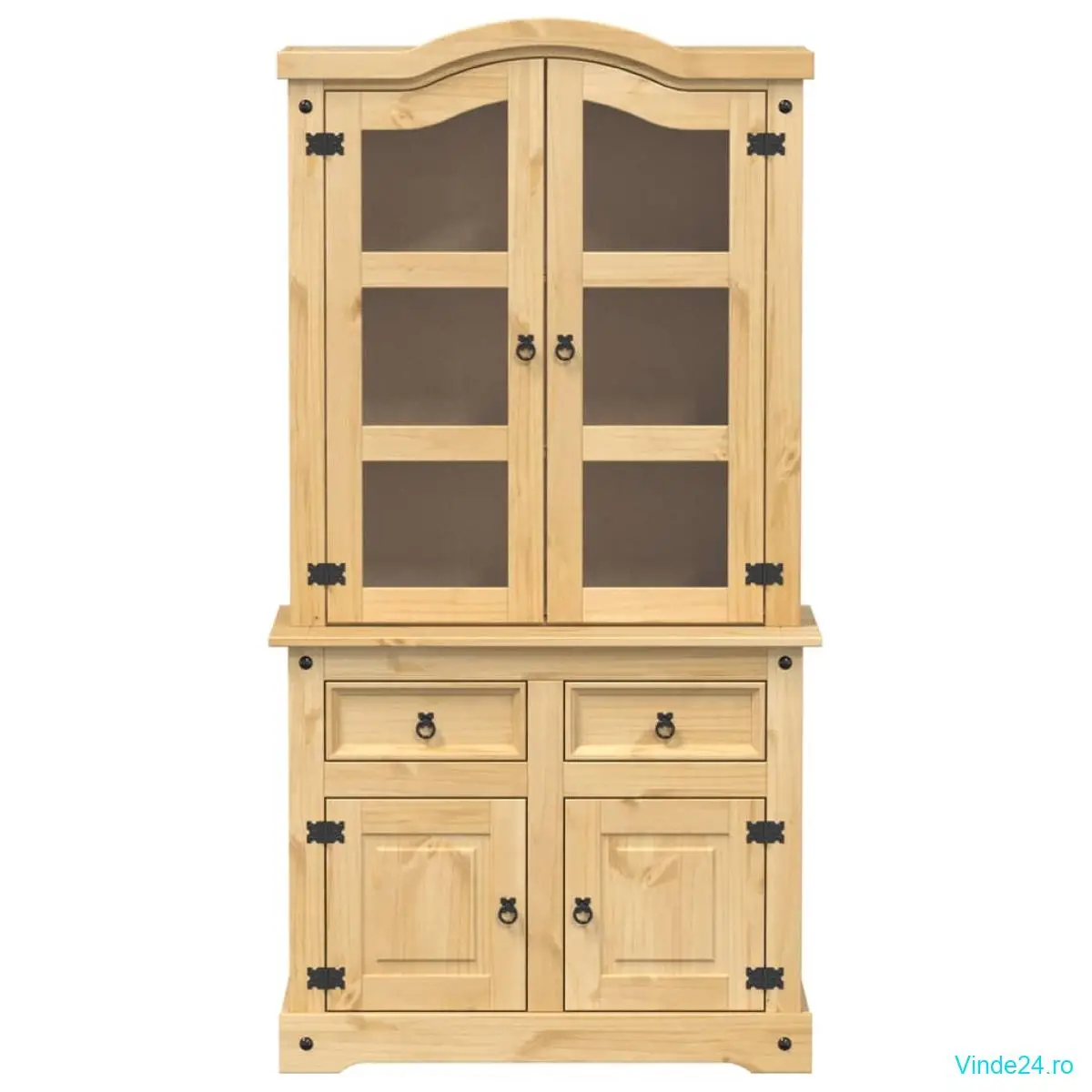 • Lemn masiv de pin: Lemnul masiv de pin este un material natural frumos. Lemnul de pin are fibre drepte, iar nodurile dau materialului originalitate și un aspect rustic. Fabricat din lemn masiv de pin, dulapul de expunere este durabil și robust.